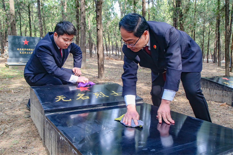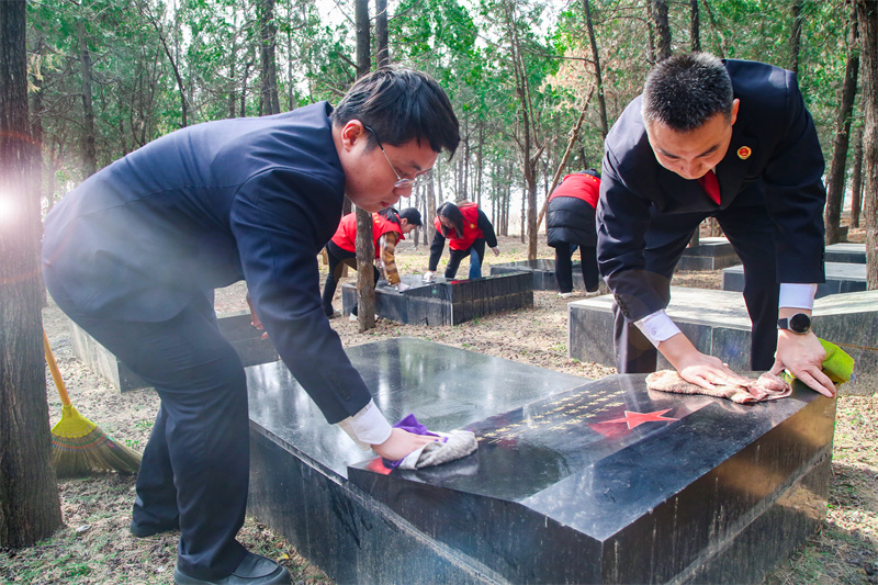 活动中,党员志愿者庄严肃立,向革命先烈集体三鞠躬,默哀致敬。志愿者主动开展擦拭墓碑、清理卫生、修剪花坛等志愿活动,以实际行动表达深切悼念和无限追思。检察官向志愿者详细讲述了如何发挥“公益诉讼+英烈保护”机制,有序推动烈士陵园选址、建设、迁葬的艰辛历程,深刻阐述了检察机关与退役军人事务部门通力协作,通过查阅大量资料、多次实地查访,成功为一名团长烈士更正身份信息的切身体会。志愿者纷纷表示,能够为缅怀先烈、传承英烈精神出一份力,是他们莫大的荣幸。